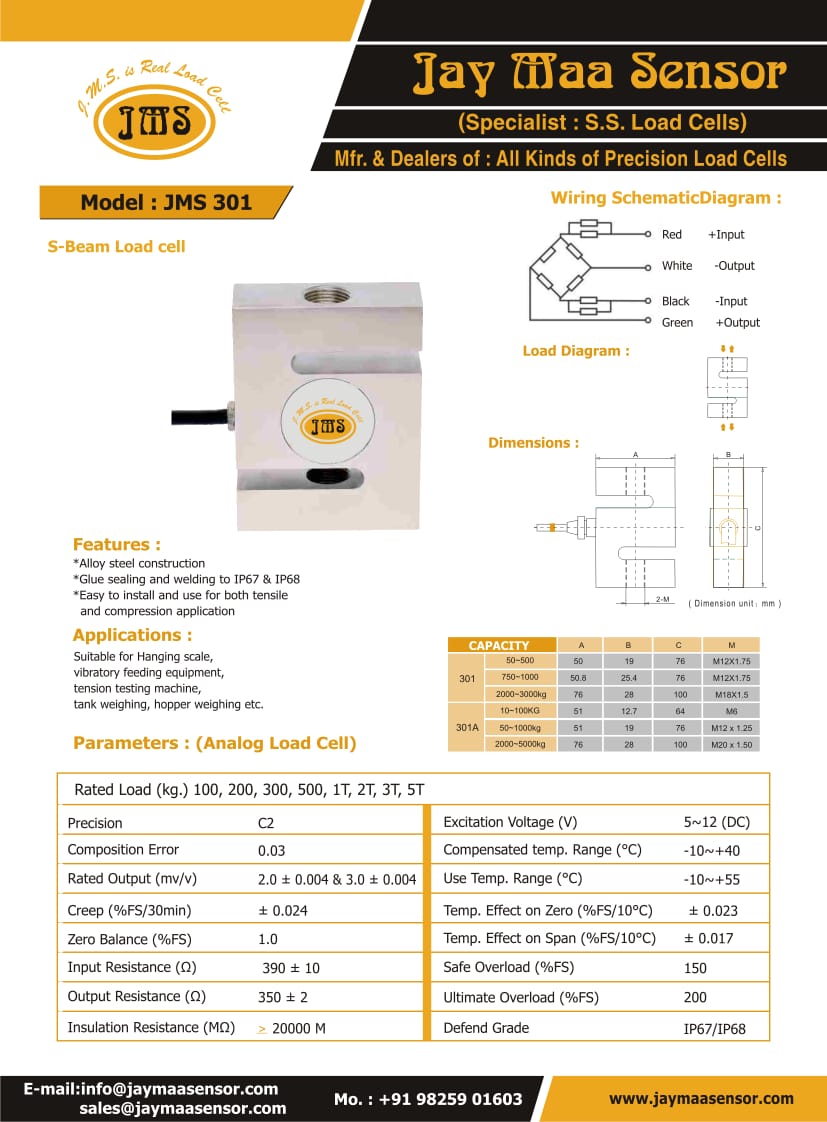 The S-type load cells that we can offer have a range of different capacities starting from 25kg up to 30 tonnes. They primarily use metal foil strain gauge technology.